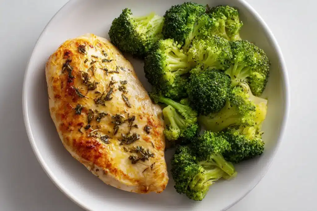 - “Close-up overhead shot of a golden baked chicken breast served next to bright green steamed broccoli on a white ceramic plate, warm kitchen lighting, home cook friendly, minimalistic background.”