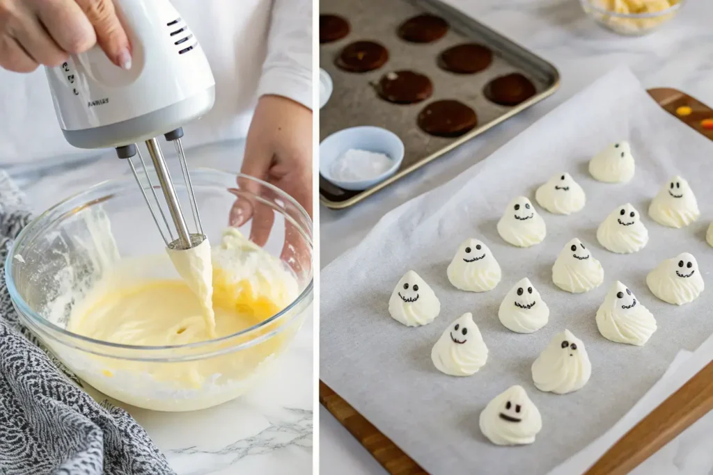 Transfer the meringue mixture into a piping bag fitted with a round tip. Pipe tall dollops onto the parchment paper — these will form the ghost bodies. Create small peaks at the top for a spooky shape.