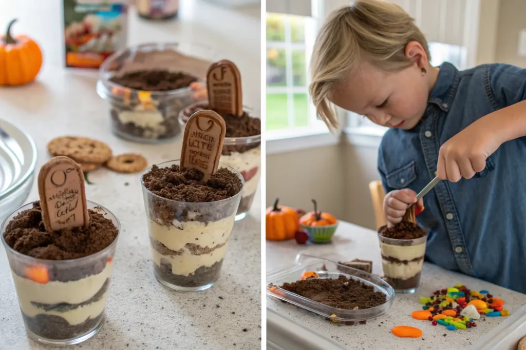 - Decorate: Insert a cookie tombstone, write “RIP” with edible gel, add gummy worms and candy pumpkins, sprinkle green coconut for grass.