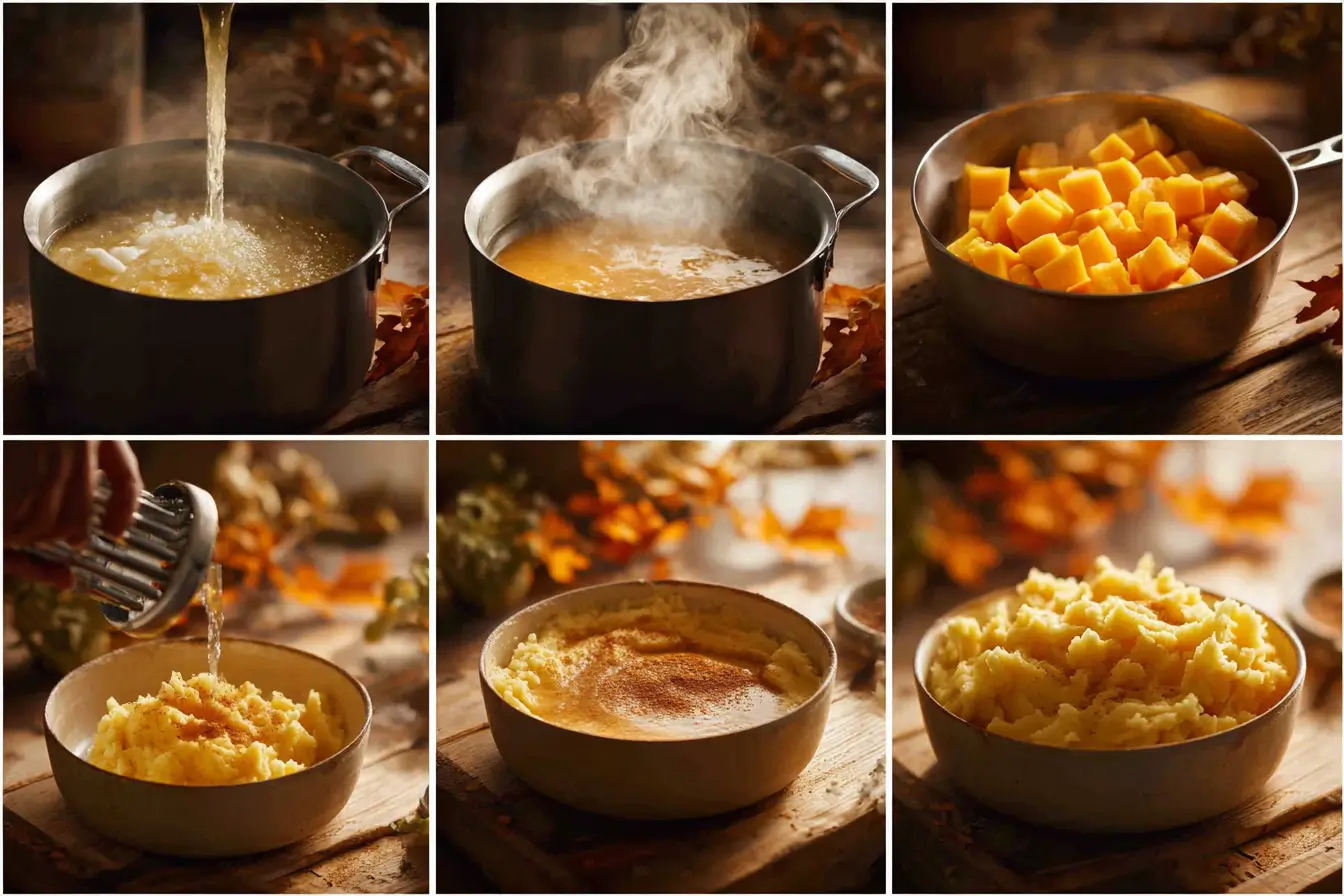Use a potato masher or electric mixer to mash the drained potatoes until smooth. Gradually pour in the warm pumpkin mixture, stirring until fully blended and creamy.